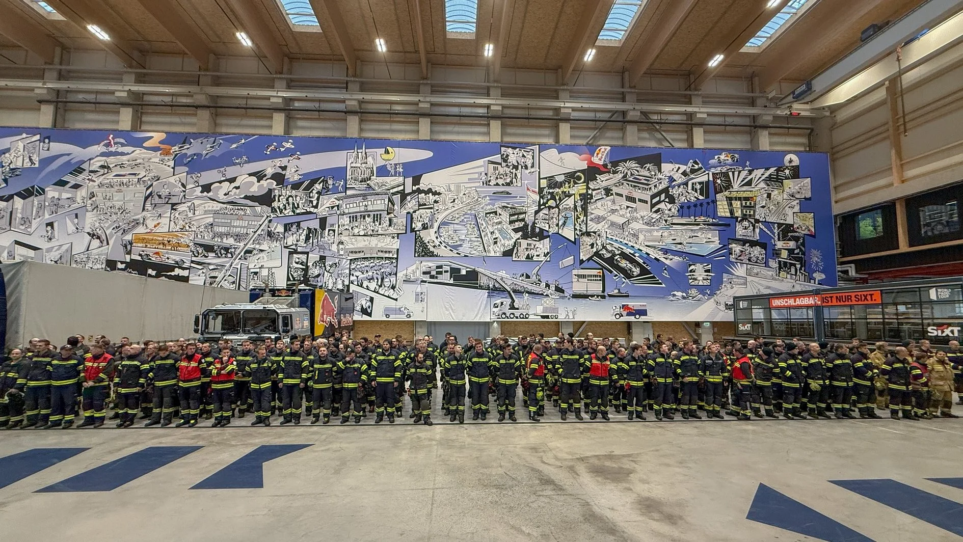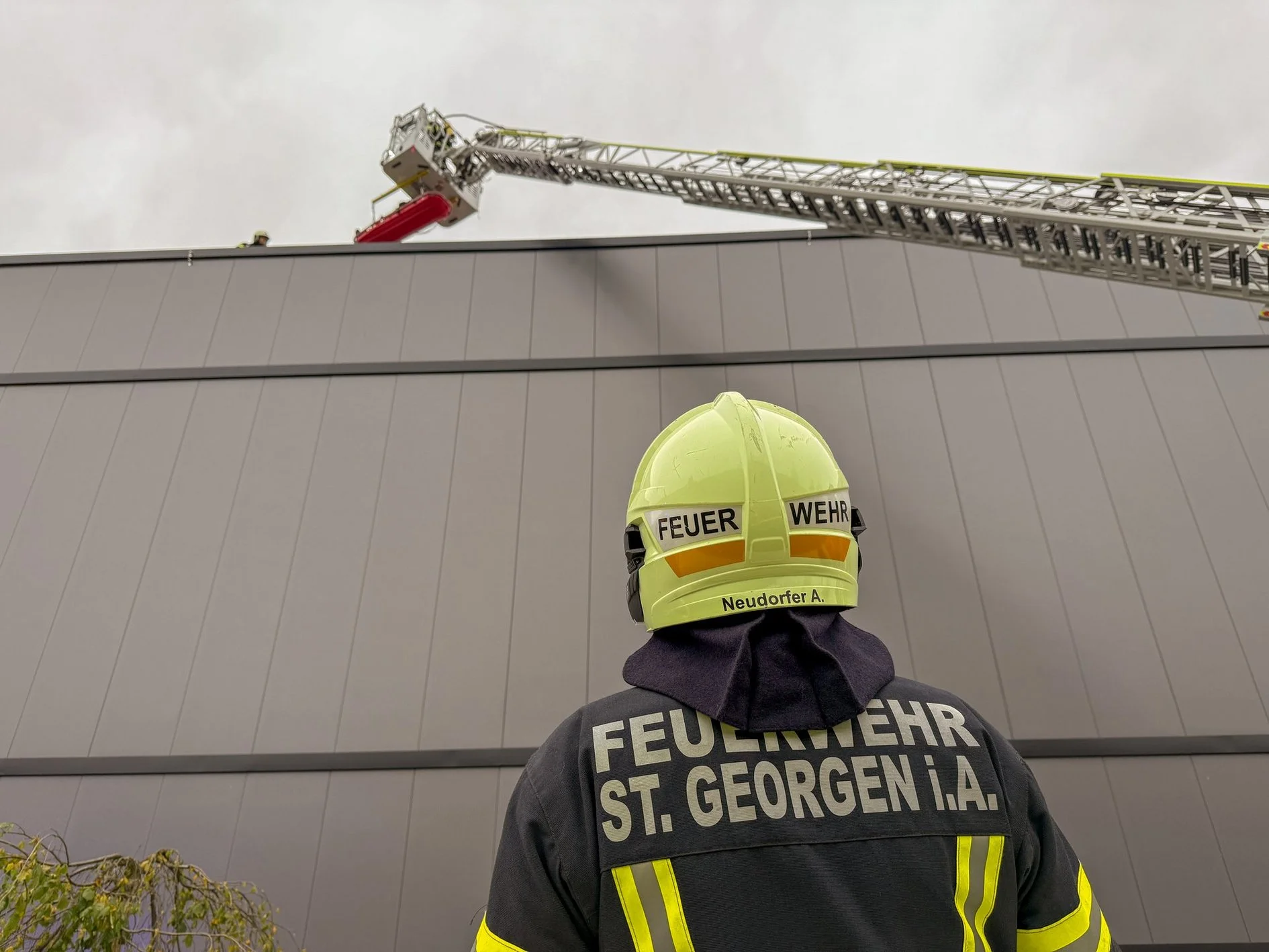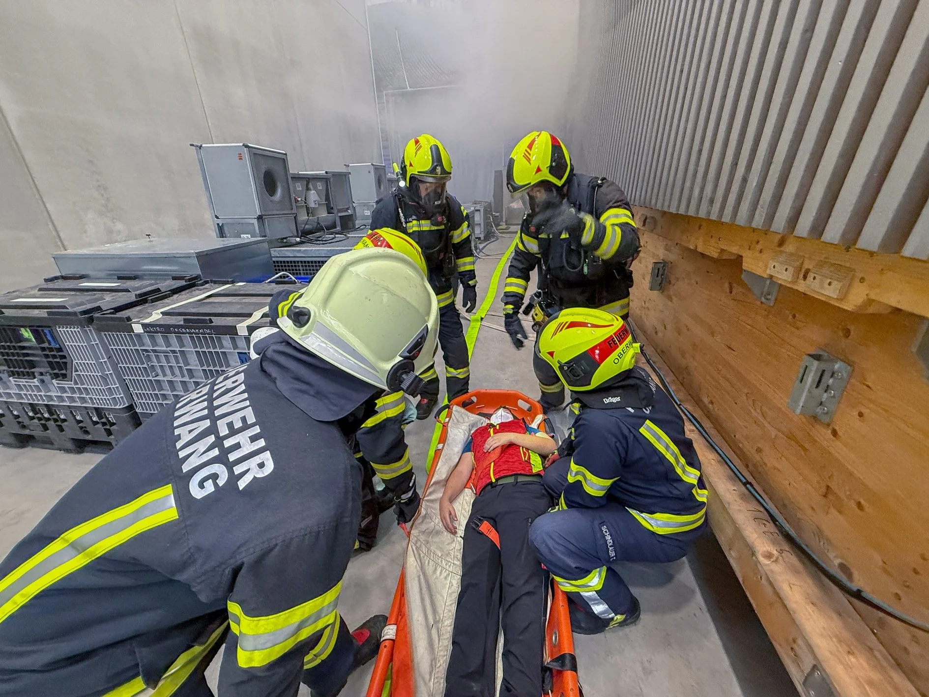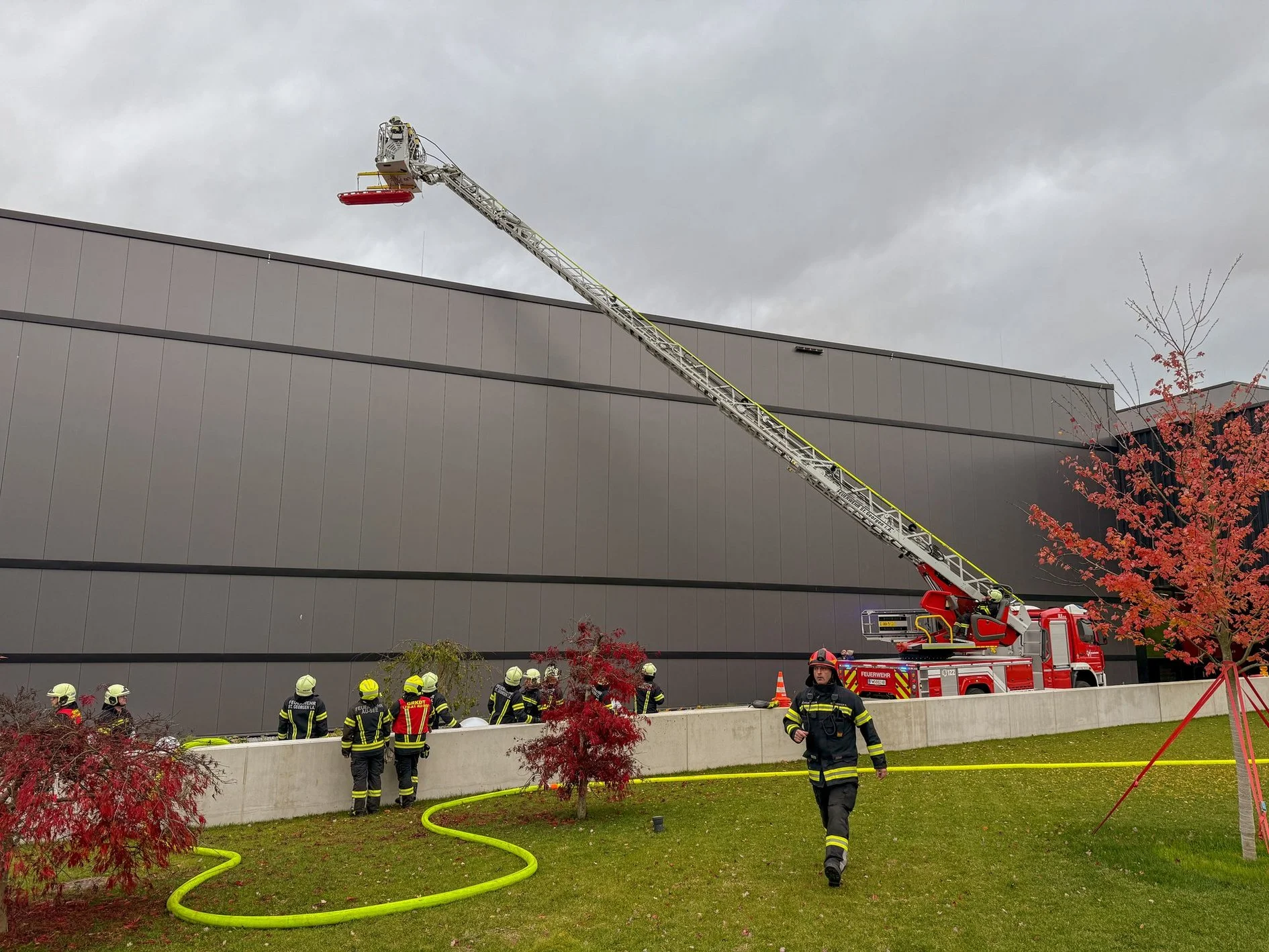 Eine weitere Herausforderung, war die Personenrettung und die Löscharbeiten am Dach der Halle. Der Brand im Inneren hatte sich auf den Dachbereich ausgebreitet. Ein Teil des Daches ist mit einer PV-Anlage ausgestattet. Eine unbekannte Zahl an Elektrikern, die Wartungsarbeiten an der PV Anlage durchführten, wurden durch die Flammen eingeschlossen.