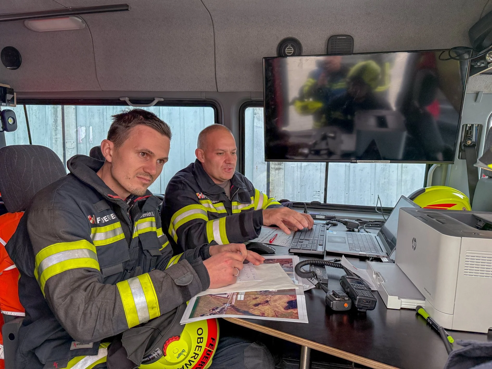 Die Teams der Drehleiter aus St. Georgen, des Hubsteigers aus Mondsee und die Drohnen der Abschnittsdrohnengruppe arbeiteten Hand in Hand bei der Personensuche am Dach und beim Identifizieren von Glutnestern. Die umfassenden Löschwasserversorgung für den Außenangriff wurde durch vier Zubringerleitung sichergestellt.