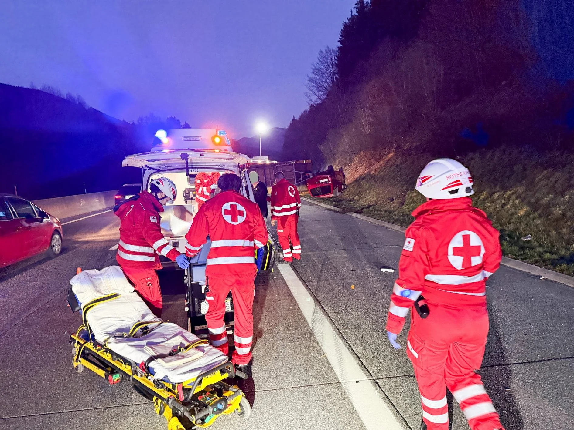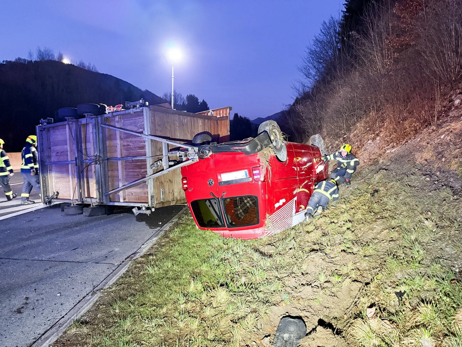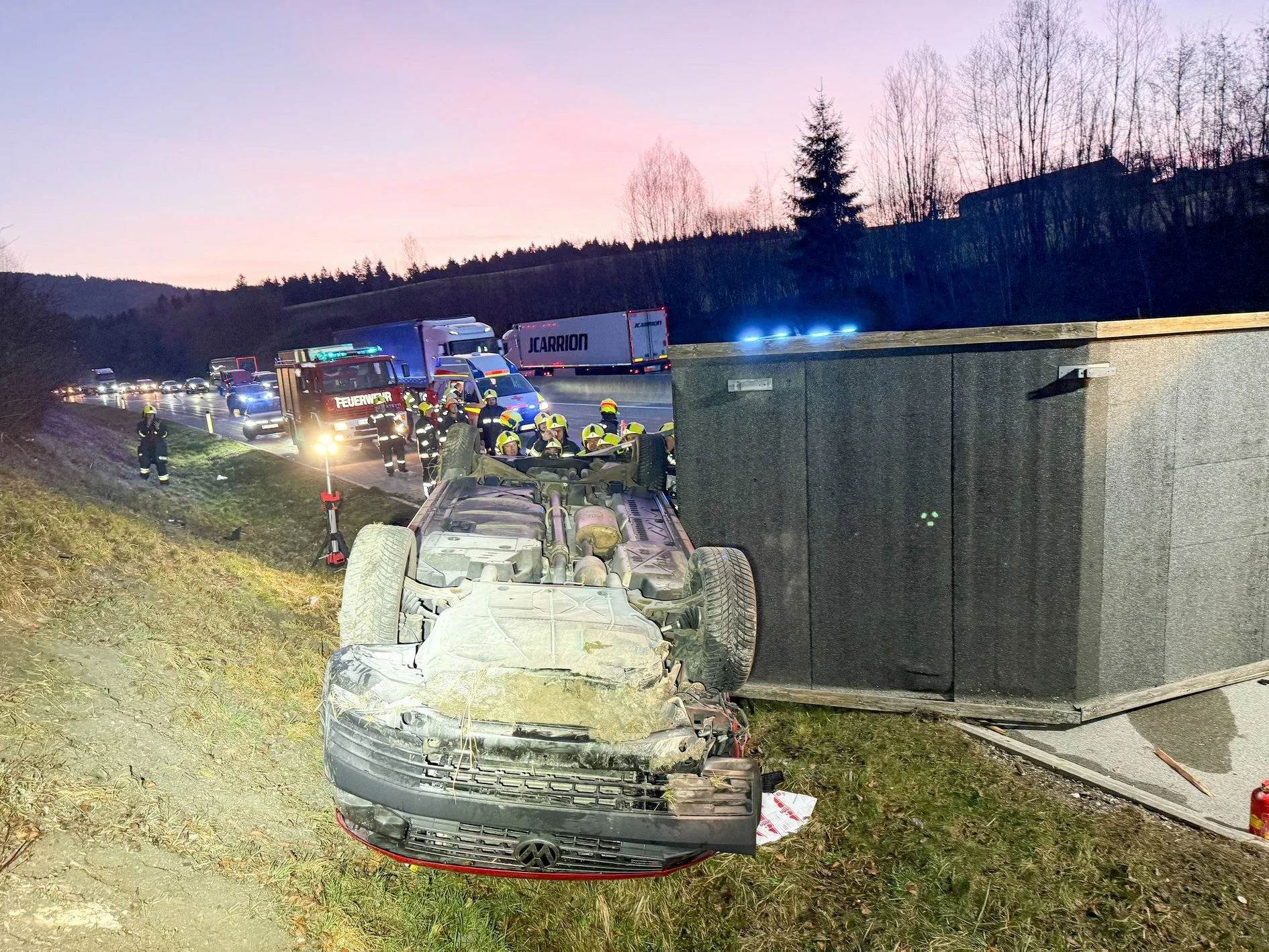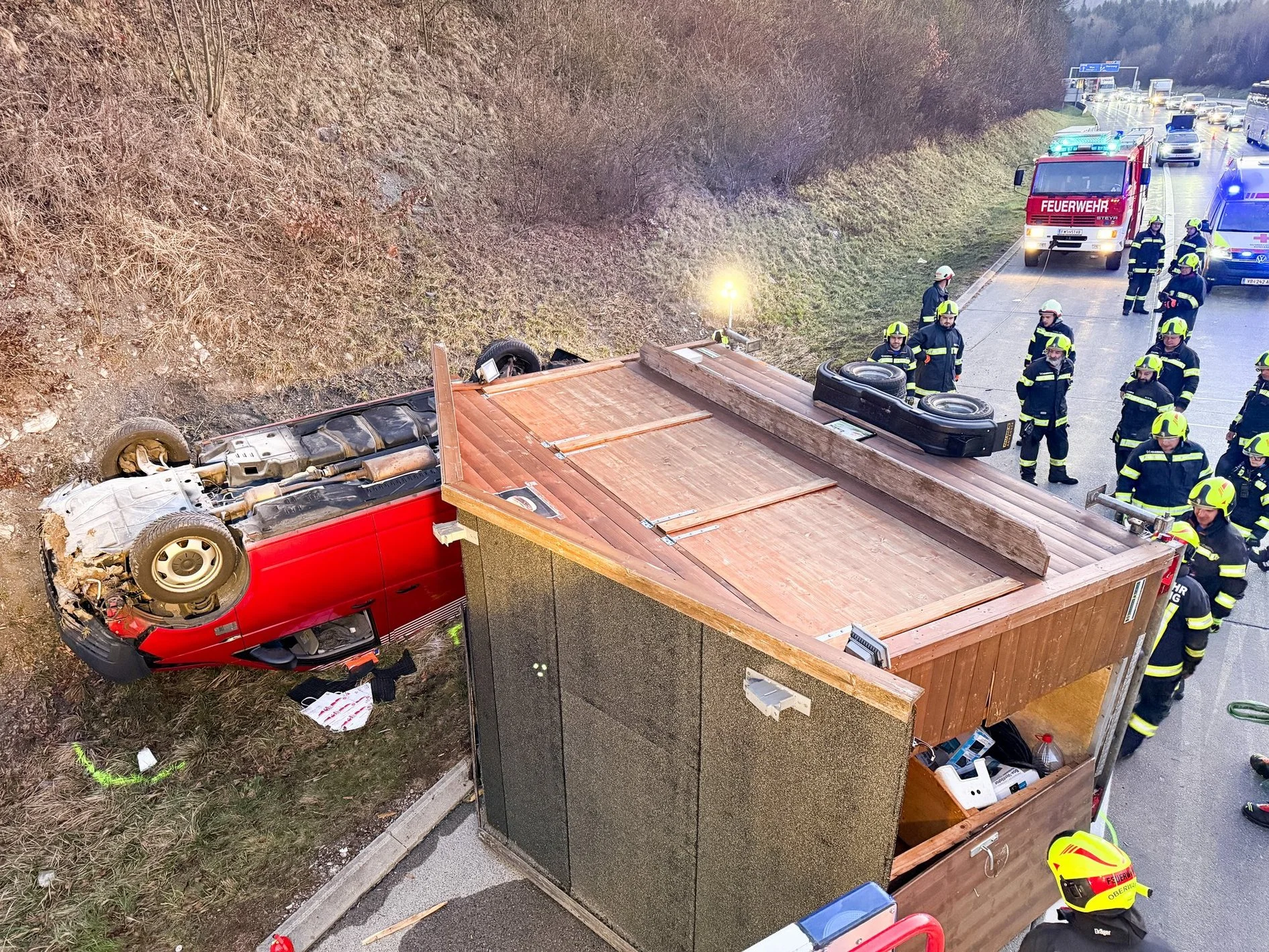 Kleinbus mit Jausenanhänger überschlägt sich auf A1