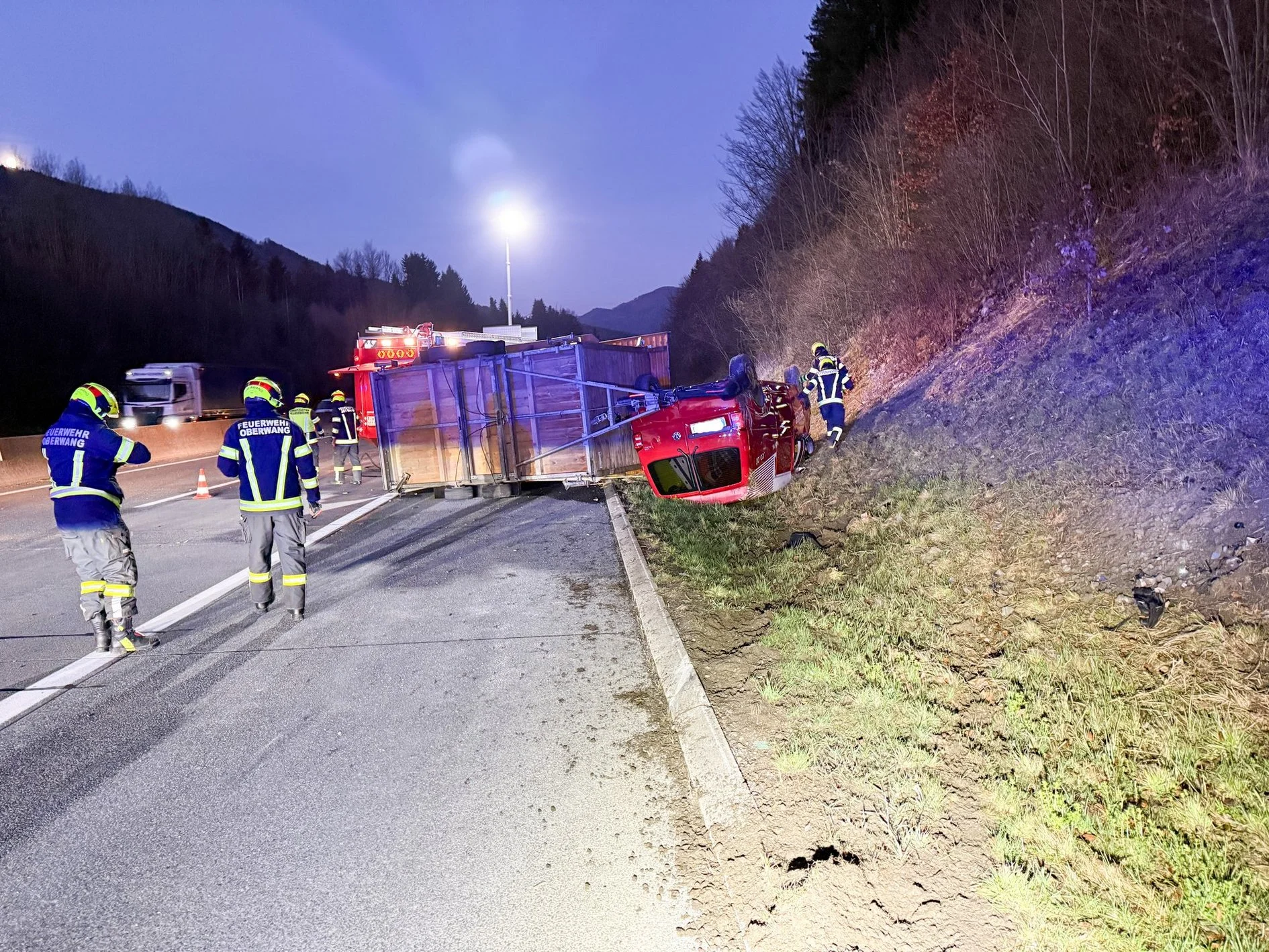 Kurz nach der Autobahnauffahrt Oberwang in Fahrtrichtung Salzburg kollidierte ein PKW mit dem Jausenanhänger eines Kleinbusses. Durch den Aufprall schleuderte der Kleinbus mit Anhänger gegen die Böschung am Fahrbandrand und überschlug sich.