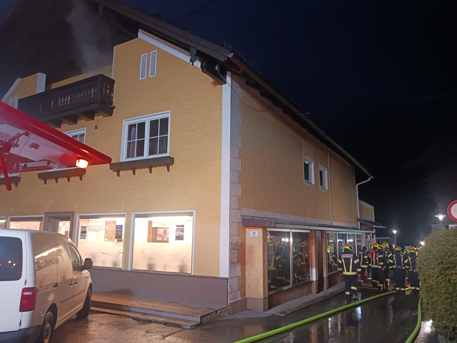 Übungsannahme war ein Brand im Vereinsheim Oberwang. Die Atemschutztrupps hatten die Aufgabe eine Person in dem verauchten Gebäude zu finden und anschließend zu retten.
